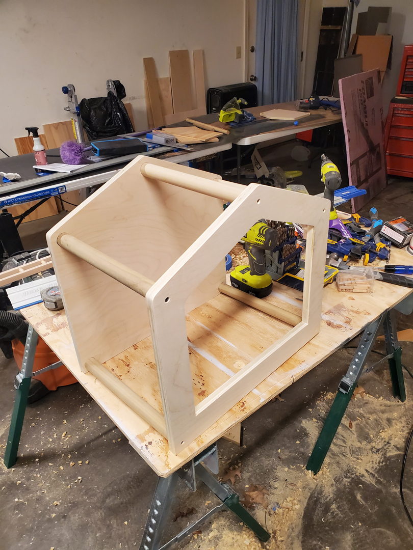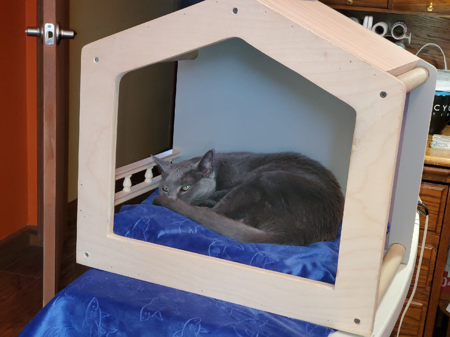 We have a Russian Blue cat named Lucy. She constantly tries to get to the highest point in the room. As we made changes to our house and removed certain pieces of furniture it removed the jump points she used to get up to the ceiling. Feeling bad that we took her ability to climb up to the ceiling; we decided to build her a house she could climb up to and rest.